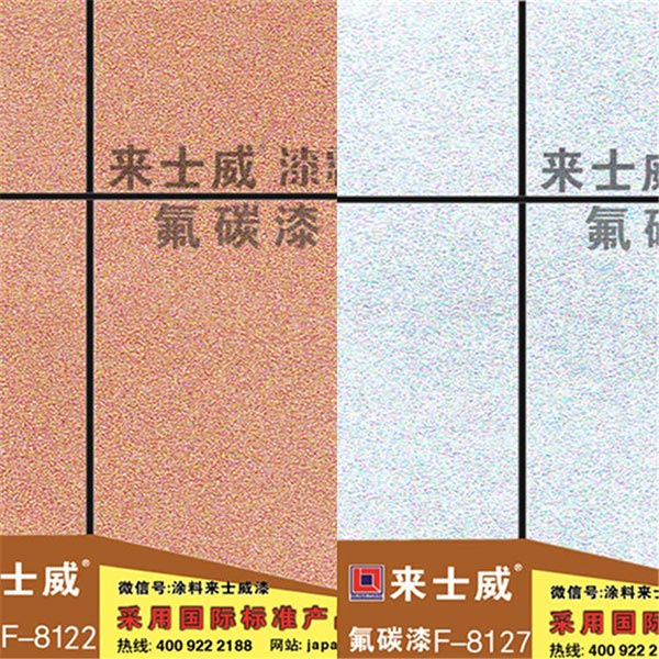 氟碳面漆是選用優(yōu)良氟碳樹脂為基料,添加助劑及各種金屬效果顏料精制而成的雙組份溶劑型外墻漆,具有良好的耐候性、抗污性和抗腐蝕性,金屬效果顏料的隨向異色性賦予漆膜很高的裝飾性和華麗的質(zhì)感。